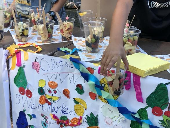 Unser großes Schulfest an der Erich-Fried-Gesamtschule startete in diesem Schuljahr mit einer feierlichen Eröffnung in der Aula. Im Rahmen der Auftaktveranstaltung erfolgte zu Beginn eine besondere Würdigung des Namensgebers unserer Schule: Die Fachschaft Geschichte überreichte der Schulgemeinde eine Infotafel zum „Nicaragua“-Gedicht von Erich Fried, aus der der historische Hintergrund und der besondere Bezug zur Namensgebung unserer Schule hervorgeht. Die Infotafel wird mit dem Nicaraguagedicht von Erich Fried ihren Platz neben der Aula im Foyer finden. Nach einer kurzen Begrüßung durch unsere Schulleiterin Frau Flowerday übernahm die Musical AG den Auftakt zur Veranstaltung mit einem Einblick in ihre aktuelle Produktion „Dream big Dreams“. Mit diesem schwungvollen Beitrag öffneten anschließend alle Stände ihre Angebote, zu denen Groß und Klein herzlich eingeladen und bereits zahlreich erschienen waren.