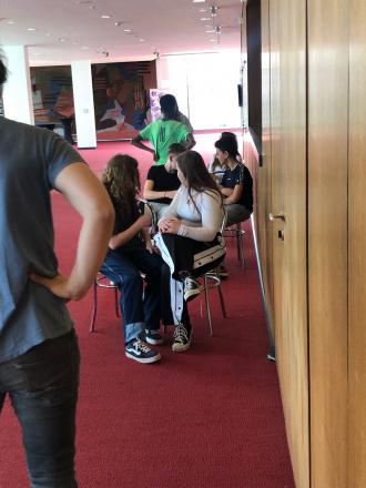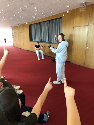 Ein ganzes Theater für die EFG-Kulturscouts: alle Flure leer, der Teppich rot und los ging's ins Schauspielabenteuer. Aus dem Nichts zauberte der Theaterpädagoge, Schauspieler und Regisseur Christoph mit den Kulturscouts ein eigenes Theaterstück. Jeder bekam eine passende Rolle, lachen inklusive, so dass es am Ende auch die Schüchternen nicht mehr auf den Stühlen hielt. Viel zu schnell waren die 2 Stunden Theaterworkshop vorbei.