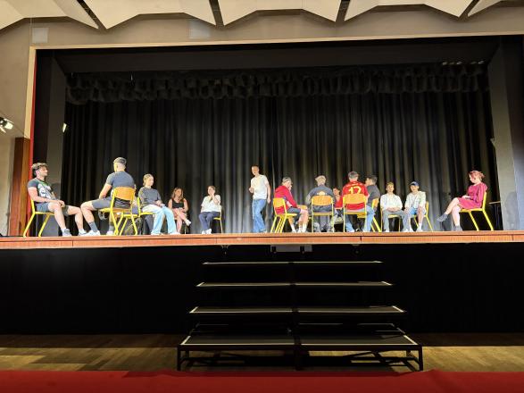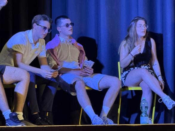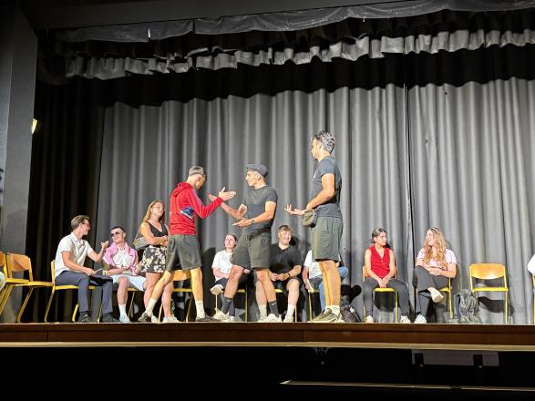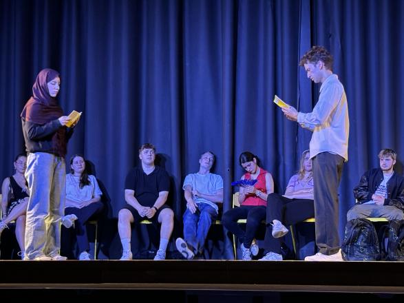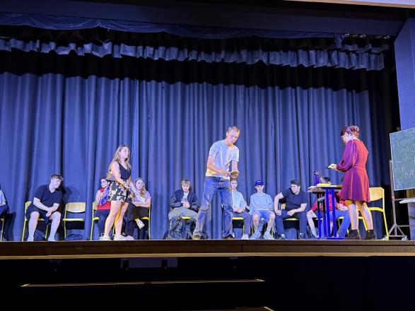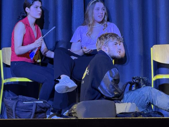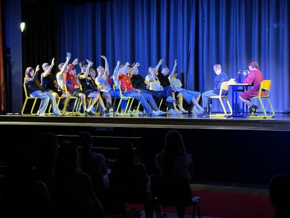 Spannung pur lieferte das Schauspielensemble konstant über 45 Minuten und überraschte das gebannte Publikum jedes Mal aufs Neue: eine großartige Schauspielleistung aller Darstellenden im Q1 Literaturkurs sowie geschickte Regie unter Leitung von Benjamin Breutel beeindruckte alle in der EFG-Aula.